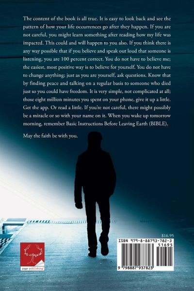 The content of the book is all true. It is easy to look back and see the pattern of how your life occurrences go after they happen. If you are not careful, you might learn something after reading how my life was impacted. This could and will happen to you also. If you think there is any way possible that if you believe and speak out loud that someone is listening, you are 100 percent correct. You do not have to believe me; the easiest, most positive way is to believe for yourself. You do not have to change anything; just as you are yourself, ask questions. Know that by finding peace and talking on a regular basis to someone who died just so you could have freedom. It is very simple, not complicated at all; those eight million minutes you spent on your phone, give it up a little. Get the app. Or read a little. If you're not careful, there might possibly be a miracle or so with your name on it. When you wake up tomorrow morning, remember Basic Instructions Before Leaving Earth (BIBLE). May the faith be with you.