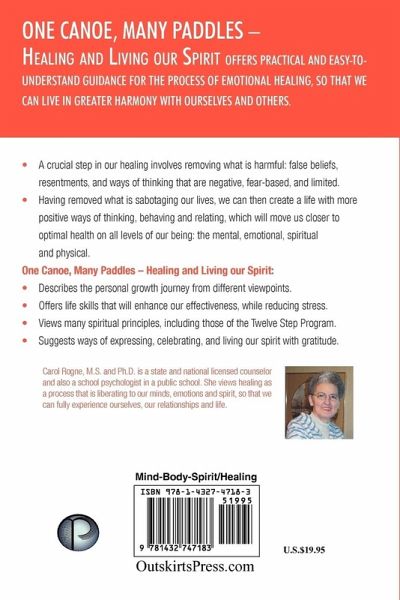 Healing and Living our Spirit offers practical and easy-to-understand guidance for the process of emotional healing, so that we can live in greater harmony with ourselves and others. ¿ A crucial step in our healing involves removing what is harmful: false beliefs, resentments, and ways of thinking that are negative, fear-based, and limited. ¿ Having removed what is sabotaging our lives, we can then create a life with more positive ways of thinking, behaving and relating, which will move us closer to optimal health on all levels of our being: the mental, emotional, spiritual and physical. One Canoe, Many Paddles - Healing and Living our Spirit: ¿ Describes the personal growth journey from different viewpoints. ¿ Offers life skills that will enhance our effectiveness, while reducing stress. ¿ Views many spiritual principles, including those of the Twelve Step Program. ¿ Suggests ways of expressing, celebrating, and living our spirit with gratitude.