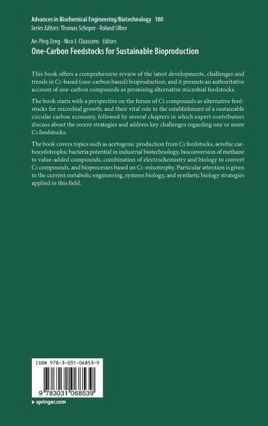 Obituary: In memory of Dr. Arren Bar-Even.- Introduction: The future belongs to the one-carbons.- Exploiting aerobic carboxydotrophic bacteria for industrial biotechnology.- Process engineering aspects of C1-conversion.- Systems biology on acetogenic bacteria for utilizing C1 feedstocks.- Systems metabolic engineering of methanotrophic bacteria for biological conversion of methane to value-added compounds.- Engineering synthetic methylotrophs by harnessing the power of metabolic engineering-guided adaptive laboratory evolution.- Bioconversion of methanol by synthetic methylotrophy.- Aerobic growth on methanol using the RuMP cycle.- Empower C1 - Combination of electrochemistry and biology to convert C1 compounds.- Extracellular electron powered microbial CO2 upgrading.- Understanding and engineering glycine cleavage system and its reversion for C1 biosynthesis.- Engineering the reductive glycine pathway - A promising synthetic metabolism approach for C1-assimilation.- Biosynthesisbased on one-carbon mixotrophy.- Conversion of carbon monoxide to chemicals by mixed culture approaches.