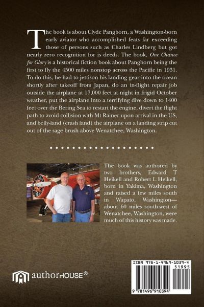 The book is about Clyde Pangborn, a Washington-born early aviator who accomplished feats far exceeding those of persons such as Charles Lindberg but got nearly zero recognition for is deeds. The book, One Chance for Glory is a historical fiction book about Pangborn being the first to fly the 4500 miles nonstop across the Pacific in 1931. To do this, he had to jettison his landing gear into the ocean shortly after takeoff from Japan, do an in-flight repair job outside the airplane at 17,000 feet at night in frigid October weather, put the airplane into a terrifying dive down to 1400 feet over the Bering Sea to restart the engine, divert the flight path to avoid collision with Mt Rainer upon arrival in the US, and belly-land (crash land) the airplane on a landing strip cut out of the sage brush above Wenatchee, Washington.