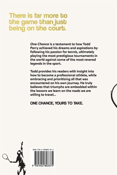There is far more to the game than just being on the court. One Chance is a testament to how Todd Perry achieved his dreams and aspirations by following his passion for tennis, ultimately playing the most prestigious tournaments in the world against some of the most revered legends in sport. Todd provides his reads with insight into how to become a professional athlete, while embracing and prioritising all that was encountered on his own journey. He truly believes that triumphs are embedded within the lessons we learn on the roads we are willing to travel... ONCE CHANCE, YOURS TO TAKE.