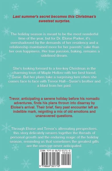 Last summer's secret becomes this Christmas's sweetest surprise. Six months ago, Eloise had a one-night stand with a charming stranger and never expected to see him again-especially after sneaking out without so much as a goodbye. Now, with Christmas around the corner, last summer's secret is about to surface in the most unexpected way. The holiday season is meant to be the most wonderful time of the year, but for Dr. Eloise Parker, it's overshadowed by the demands of her residency and a relationship maintained more for her parents' sake than her own happiness. Her true passion, baking, remains a sidelined dream. She's looking forward to a low-key Christmas in the charming town of Maple Hollow with her best friend, Susie. But her plans take a surprising turn when she comes face to face with Trevor Hall-Susie's brother and her one-night stand. Trevor, anticipating a serene holiday before his nomadic adventures, finds his plans thrown into disarray by Eloise's arrival. Their brief, fiery past encounter left an indelible mark, reigniting a mix of old emotions and unanswered questions. Through Eloise and Trevor's alternating perspectives, this story delicately weaves together the threads of personal growth and the enduring magic of the holiday season, reminding us that sometimes the greatest gifts are the ones we never anticipated.