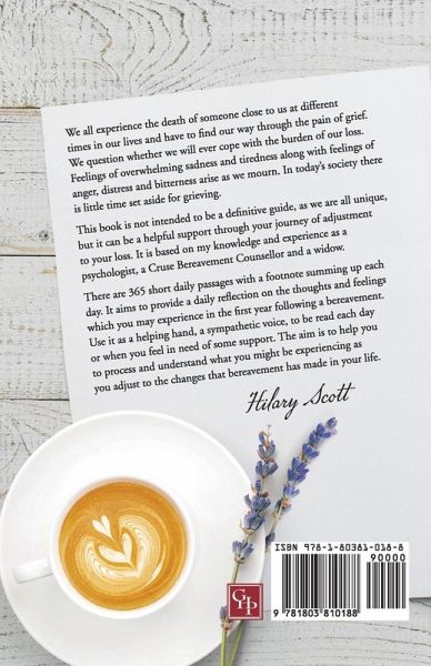 We all experience the death of someone close to us at different times in our lives and have to find our way through the pain of grief. We question whether we will ever cope with the burden of our loss. Feelings of overwhelming sadness and tiredness along with feelings of anger, distress and bitterness arise as we travel through our passage of mourning. In today's society there is little time set aside for grieving. This book is not intended to be a definitive guide, as we are all unique, but it can be a helpful support through your journey of adjustment to your loss. It is designed to be a handy companion at times of turmoil helping you to understand the normal processes of grief. The book is based on my knowledge and experience as a psychologist, a Cruse Bereavement Counsellor and a widow. There are 365 short daily passages with a footnote at the bottom of each page providing a thought to focus on. it aims to provide a daily reflection on the thoughts and feelings which you may experience in the first year following a bereavement. Use it as a helping hand, a sympathetic voice, to be read each day or when you feel in need of some support. The aim is to help you to process and understand what you might be experiencing as you adjust to the changes that bereavement has made in your life. Through this journey of grieving there are references to feelings of fear about how to live your life in a changed emotional landscape. The bereaved person has to adapt and change on a core level in their life. It is natural that you experience many emotions, whether the death experienced is that of a father, mother, brother, sister, child, close friend, partner, husband, wife, or grandparent. There may be feelings of grief associated with the death of a marriage or partnership. We all experience bereavement at different times in our life and we have to find our way through a maze of grief. There are times when we wonder how we can carry on with this burden, but we do. Feelings can be further complicated if the person who has died has caused hurt to us in some way. Feelings of anger can be overwhelming, and memories which arise can give cause for distress. It is helpful to your healing if you can work through your feelings and your memories at a pace you can cope with. Grieving is a journey that at some point we all find ourselves on.