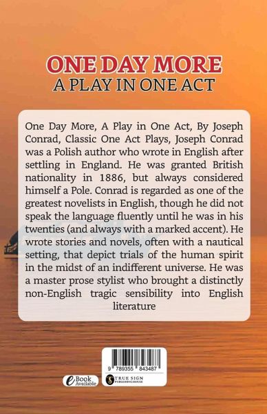 One Day More, A Play in One Act, By Joseph Conrad, Classic One Act Plays, Joseph Conrad was a Polish author who wrote in English after settling in England. He was granted British nationality in 1886, but always considered himself a Pole. Conrad is regarded as one of the greatest novelists in English, though he did not speak the language fluently until he was in his twenties (and always with a marked accent). He wrote stories and novels, often with a nautical setting, that depict trials of the human spirit in the midst of an indifferent universe. He was a master prose stylist who brought a distinctly non-English tragic sensibility into English literature