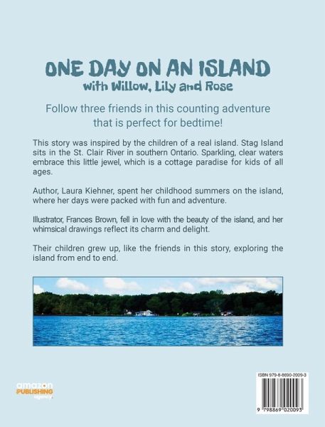 Follow three friends in this counting adventure that is perfect for bedtime! This story was inspired by the children of a real island. Stag Island sits in the St. Clair River in southern Ontario. Sparkling, clear waters embrace this little jewel, which is a cottage paradise for kids of all ages. Author, Laura Kiehner, spent her childhood summers on the island, where her days were packed with fun and adventure. Illustrator, Fran Brown, fell in love with the beauty of the island, and her whimsical drawings reflect its charm and delight. Fran and Laura are grateful their children grew up as friends, like the ones in this story, on our magical island.