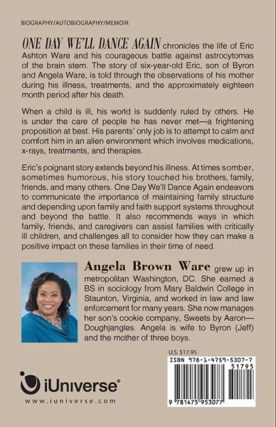 One Day We'll Dance Again chronicles the life of Eric Ashton Ware and his courageous battle against astrocytomas of the brain stem. The story of six-year-old Eric, son of Byron and Angela Ware, is told through the observations of his mother during his illness, treatments, and the approximately eighteen month period after his death. When a child is ill, his world is suddenly ruled by others. He is under the care of people he has never met-a frightening proposition at best. His parents' only job is to attempt to calm and comfort him in an alien environment which involves medications, x-rays, treatments, and therapies. Eric's poignant story extends beyond his illness. At times somber, sometimes humorous, his story touched his brothers, family, friends, and many others. One Day We'll Dance Again endeavors to communicate the importance of maintaining family structure and depending upon family and faith support systems throughout and beyond the battle. It also recommends ways in which family, friends, and caregivers can assist families with critically ill children, and challenges all to consider how they can make a positive impact on these families in their time of need.