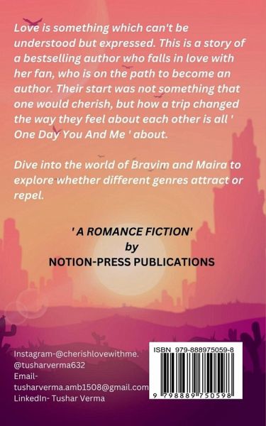 Love is something which can't be understood but expressed. This is a story of a bestselling author who falls in love with her fan, who is on the path to become an author. Their start was not something that one would cherish, but how a trip changed the way they feel about each other is all ' One Day You And Me ' about. Dive into the world of Bravim and Maira to explore whether different genres attract or repel.