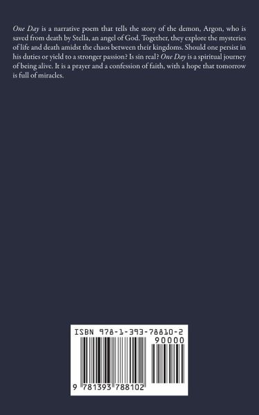 One Day is a narrative poem that tells the story of the demon, Argon, who is saved from death by Stella, an angel of God. Together, they explore the mysteries of life and death amidst the chaos between their kingdoms. Should one persist in his duties or yield to a stronger passion? Is sin real? One Day is a spiritual journey of being alive. It is a prayer and a confession of faith, with a hope that tomorrow is full of miracles. XXXVII "What is a star?" Argon wonders "if not to explode and grant a wish if not my head, falling on her lap of dreams What is a star if not to imitate the glow on Stella's face or to repeat myself and my love as she sleeps For a star can mean a million things at once but what good is a star, even for dreamers if it does not shine where she lies For every dream can fall as a new wish can rise but nothing escapes her eyes."