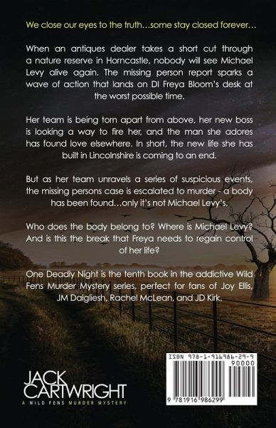 We close our eyes to the truth...some stay closed forever... When an antiques dealer takes a short cut through a nature reserve in Horncastle, nobody will see Michael Levy alive again. The missing person report sparks a wave of action that lands on DI Freya Bloom's desk at the worst possible time. Her team is being torn apart from above, her new boss is looking a way to fire her, and the man she adores has found love elsewhere. In short, the new life she has built in Lincolnshire is coming to an end. But as her team unravels a series of suspicious events, the missing persons case is escalated to murder - a body has been found...only it's not Michael Levy's. Who does the body belong to? Where is Michael Levy? And is this the break that Freya needs to regain control of her life? One Deadly Night is the tenth book in the addictive Wild Fens Murder Mystery series, perfect for fans of Joy Ellis, JM Dalgliesh, Rachel McLean, and JD Kirk.
