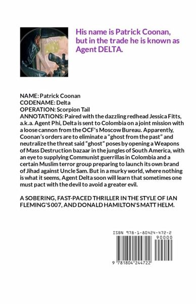 NAME: Patrick Coonan CODENAME: Delta OPERATION: Scorpion Tail ANNOTATIONS: Paired with the dazzling redhead Jessica Fitts, a.k.a. Agent Phi, Delta is sent to Colombia on a joint mission with a loose cannon from the OCF's Moscow Bureau. Apparently, Coonan's orders are to eliminate a "ghost from the past" and neutralize the threat said "ghost" poses by opening a Weapons of Mass Destruction bazaar in the jungles of South America, with an eye to supplying Communist guerrillas in Colombia and a certain Muslim terror group preparing to launch its own brand of Jihad against Uncle Sam. But in a murky world, where nothing is what it seems, Agent Delta soon will learn that sometimes one must pact with the devil to avoid a greater evil. A SOBERING, FAST-PACED THRILLER IN THE STYLE OF IAN FLEMING'S 007 AND DONALD HAMILTON'S MATT HELM.
