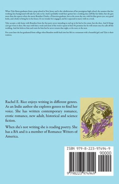 When Tyler Burns graduates from a prep school in New Jersey and is the valedictorian of her prestigious high school, she assumes that her working-class background will take her only so far. And it probably would have gotten her a working-class stiff like her father, but she gets more than she expects when she meets Brandon Charles, a Princeton graduate, hot as the noon-day sun, with his blue-green eyes, sexy good looks, and a body to bring her to her knees. It's no wonder he's engaged, and he's expected to marry within a week. Tyler accepts a ride home with Brandon from the frat party, never intending to end up in his bed at his estate, but she does. And if things can't get worse it does. She stays with him for a week, and most of the week is spent in bed. He promises her he will return once he calls off the wedding. And she believes him and waits for him, but he never returns that night, or the next, or the next. Five years later, she has graduated from college, when Brandon strolls back into her life in a restaurant with a beautiful girl, and Tyler is their waitress.