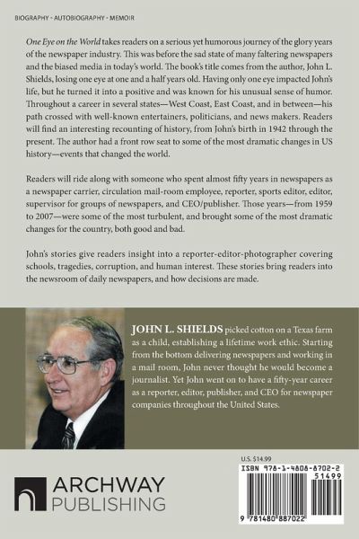 One Eye on the World takes readers on a serious yet humorous journey of the glory years of the newspaper industry. This was before the sad state of many faltering newspapers and the biased media in today's world. The book's title comes from the author, John L. Shields, losing one eye at one and a half years old. Having only one eye impacted John's life, but he turned it into a positive and was known for his unusual sense of humor. Throughout a career in several states-West Coast, East Coast, and in between-his path crossed with well-known entertainers, politicians, and news makers. Readers will find an interesting recounting of history, from John's birth in 1942 through the present. The author had a front row seat to some of the most dramatic changes in US history-events that changed the world. Readers will ride along with someone who spent almost fifty years in newspapers as a newspaper carrier, circulation mail-room employee, reporter, sports editor, editor, supervisor for groups of newspapers, and CEO/publisher. Those years-from 1959 to 2007-were some of the most turbulent, and brought some of the most dramatic changes for the country, both good and bad. John's stories give readers insight into a reporter-editor-photographer covering schools, tragedies, corruption, and human interest. These stories bring readers into the newsroom of daily newspapers, and how decisions are made.