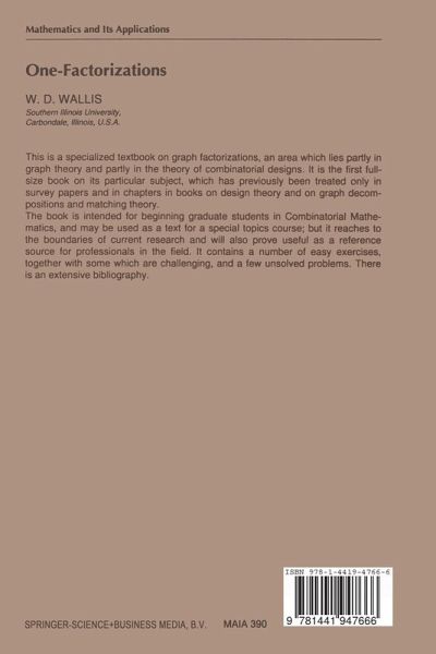 This book has grown out of graduate courses given by the author at Southern Illinois University, Carbondale, as well as a series of seminars delivered at Curtin University of Technology, Western Australia. The book is intended to be used both as a textbook at the graduate level and also as a professional reference. The topic of one-factorizations fits into the theory of combinatorial designs just as much as it does into graph theory. Factors and factorizations occur as building blocks in the theory of designs in a number of places. Our approach owes as much to design theory as it does to graph theory. It is expected that nearly all readers will have some background in the theory of graphs, such as an advanced undergraduate course in Graph Theory or Applied Graph Theory. However, the book is self-contained, and the first two chapters are a thumbnail sketch of basic graph theory. Many readers will merely skim these chapters, observing our notational conventions along the way. (These introductory chapters could, in fact, enable some instructors to Ilse the book for a somewhat eccentric introduction to graph theory.) Chapter 3 introduces one-factors and one-factorizations. The next two chapters outline two major application areas: combinatorial arrays and tournaments. These two related areas have provided the impetus for a good deal of study of one-factorizations.
