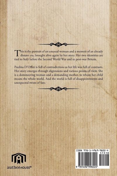 This is the portrait of an unusual woman and a memoir of an already distant era, brought alive again by her story. Her two identities are tied to Italy before the Second World War and to post-war Britain. Paulina D'Offizi is full of contradictions as her life was full of contrasts. Her story emerges through digressions and various points-of-view. She is a domineering woman and a demanding mother, to whom her child means the whole world. And the world is full of disappointments and unexpected twists of fate.