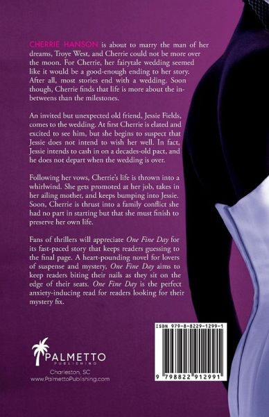 Cherrie Hanson is headed to the altar to marry the man of her dreams, but the arrival of an unexpected old friend, Jessie Fields, throws her world into conflict. Cherrie has a sinking suspicion that Jessie isn't here to wish her well. Cherrie Hanson always thought that her fairytale wedding to Troye West would have been a good enough ending to her story. Invited, but unexpected, her old friend Jessie Fields pays her a visit and seems to be intent on cashing in on a decades-old pact. After walking down the aisle and declaring her vows, Cherrie's life turns into a whirlwind. She gets promoted at her job, takes in her ailing mother, and strangely keeps bumping into Jessie. Before she realizes, Cherrie is thrown into a family conflict that she had no part in starting but that she must finish or risk losing everything. Written to keep readers on the edge of their seats, One Fine Day is a fast-paced heart-pounding thriller for the reader looking for their anxiety fix. One Fine Day aims to make fans of suspenseful mysteries fly through the pages and keep guessing to the final chapter. One Fine Day will appeal to readers looking for a book similar in feel to a suspense movie.