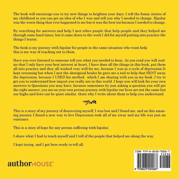 The book will encourage you to try new things to brighten your days. I tell the funny stories of my childhood so you can get an idea of who I was and tell you why I needed to change. Bipolar was the worst thing that ever happened to me but it was the best too because I needed to change. By searching for answers and help I met other people that help people and they helped me through some hard times, but it came down to the work I did for myself putting into practice the things I learnt. The book is my journey with bipolar for people in the same situation who want help this is my way of reaching out to them. Have you ever listened to someone tell you what you needed to hear, As you read you will realize that I only have your best interest at heart, I have done all the things in this book, put them all into practice and they all worked very well for me, because I was in a cycle of depression It kept returning but when I met the aboriginal healer he gave me a tool to help that SENT away the depression. because I USED his method. which I am sharing with you in my book. I try to get you to understand how import you really are in this world. I hope you will look for your own answers to Questions you may have, because sometimes by just asking a question you will get the right answer, you are on your own person journey with bipolar our lives are not the same but our highs and lows can be quiet similar. thats why I write about them to help you understand.