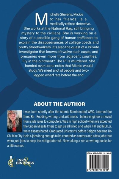 Michelle Stevens, Mickie to her friends, is a medically retired detective. She works at the National Rag, still bringing mystery to the civilians. She is working on a story of a possible gang of human traffickers to explain the disappearances of college coeds and pretty streetwalkers. It's also the quest of a Private Investigator that knows of twelve such cases, and presumes even more from adjacent counties. Fly in the ointment? The PI is murdered. She handed over some notes that Mickie would study. We meet a lot of people and two-legged wharf rats before the end. I was born shortly after the Atomic Bomb ended WW2. Learned the three Rs - Reading, writing, and arithmetic - before engineers moved from slide rules to computers. Was in high school when we expected the Cuban Missile Crisis to get us all killed and when JFK and MLK, Jr. were assassinated. Graduated University before Saigon became Ho Chi Min City. Held 4 jobs long enough to be counted as careers and a few jobs that were just jobs to keep the refrigerator full. Now taking a run at writing books for a fifth career.