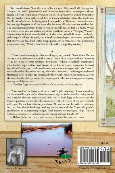 Fr. "Jake" Jakubowski, a 70-year-old Michigan priest temporarily assigned to a New Mexican village, helps Detective Sonia Mora investigate a fetus found in an irrigation sluice, which prompts reopening a cold case about the death of a wealthy rancher's wife. The picketing of a soldier's funeral that turns deadly; a brash anthropologist's excavation for Civil War Apache scout remains; and Mexican folk healing customs to cure a daughter of the debilitating effects of her father's Prolonged Grief Disorder, propel the plot amid a stunning landscape of contemporary New Mexico. In a sequel to The Ghosts of Glorieta, Fr. "Jake" Jakubowski, a 70-year-old Michigan priest, is again embroiled in criminal activity at the fictional New Mexico village of Providencia. The discovery of a fetus in an irrigation sluice prompts Detective Sonia Mora to reopen a cold case involving the "accidental" death of a rancher's wife. His daughter, Dulci, struggles to escape the suffocating effects of her father's Prolonged Grief Disorder and a Mexican folk healer's treatments. A fundamentalist church's picketing of a soldier's funeral twice turns deadly for the priest; a brash anthropologist purports to have found remains of an Apache scout in a Civil War fort's cemetery; and a thwarted helicopter escape plan results in the establishment of a horse sanctuary that helps Dulci recover. Several village residents from Ghosts reappear amid a background of contemporary New Mexican secular and religious customs and locations. -- "There is much to enjoy in this compelling mystery novel: Noyer's New Mexico setting is rich in descriptions, with a central theme of an irrigation sluice (acequia) - the life blood of rural residents' livelihoods - which is skillfully intertwined with bodies, superstitions and drama. A well drawn plot represents fictional Providencia's laborers, ranch hands, servants and townspeople, with the "haves" miserable in their luxurious setting, while the "have nots," including transplanted Michigan priest, Fr. Jake, are sustained by their work, religion and customs. A fetus discovered in the sluice prompts the reopening of a cold case and engages an ongoing mystery until the very end." - Carolyn Page , co-author Bones of Contention: A Maine Mystery "After reading the Prologue of the second Fr. Jake Mystery, I knew something sinister would happen: under a blue September sky, an Arabian stallion being loaded into a trailer abruptly rears up and kicks out its hind legs; both horse and the female equestrian owner die. This accident sets the direction of the novel, which will engulf Father Jake thirteen years later. The author uses his skills to paint you into the New Mexico landscape, making readers one with the 70-year-old priest's parishioners in experiencing danger, local history, archaeological digs, folklore customs, contemporary Catholicism, and final resolution. Excellent!" - Helen Robertson, artist and designer of www.Robertson-art.com