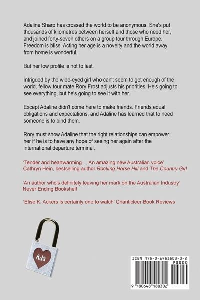 Adaline Sharp has crossed the world to be anonymous. She's put thousands of kilometres between herself and those who need her, and joined forty-seven others on a group tour through Europe. Freedom is bliss. Acting her age is a novelty and the world away from home is wonderful. But her low profile is not to last. Intrigued by the wide-eyed girl who can't seem to get enough of the world, fellow tour mate Rory Frost adjusts his priorities. He's going to see everything, but he's going to see it with her. Except Adaline didn't come here to make friends. Friends equal obligations and expectations, and Adaline has learned that to need someone is to bind them. Rory must show Adaline that the right relationships can empower her if he is to have any hope of seeing her again after the international departure terminal.