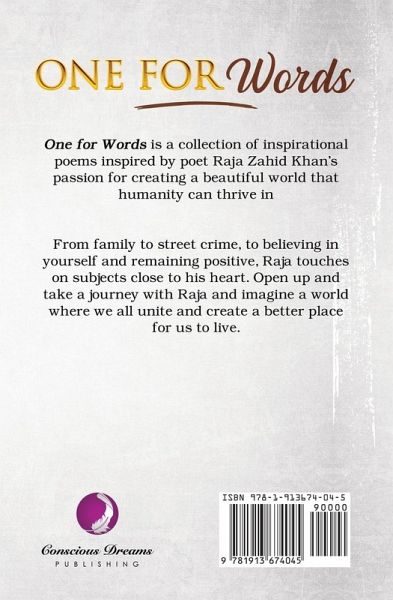 One for Words is a collection of inspirational poems inspired by poet Raja Zahid Khan’s passion for creating a beautiful world that humanity can thrive in. From family to street crime, to believing in yourself and remaining positive, Raja touches on subjects close to his heart. Open up and take a journey with Raja and imagine a world where we all unite and create a better place for us to live.
