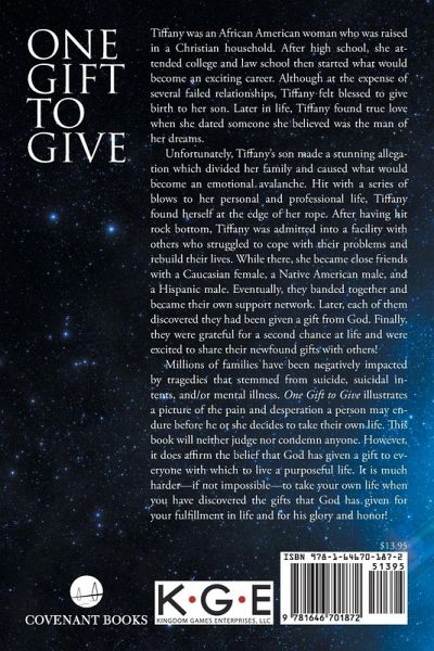 Tiffany was an African American woman who was raised in a Christian household. After high school, she attended college and law school then started what would become an exciting career. Although at the expense of several failed relationships, Tiffany felt blessed to give birth to her son. Later in life, Tiffany found true love when she dated someone she believed was the man of her dreams. Unfortunately, Tiffany’s son made a stunning allegation which divided her family and caused what would become an emotional avalanche. Hit with a series of blows to her personal and professional life, Tiffany found herself at the edge of her rope. After having hit rock bottom, Tiffany was admitted into a facility with others who struggled to cope with their problems and rebuild their lives. While there, she became close friends with a Caucasian female, a Native American male, and a Hispanic male. Eventually, they banded together and became their own support network. Later, each of them discovered they had been given a gift from God. Finally, they were grateful for a second chance at life and were excited to share their newfound gifts with others! Millions of families have been negatively impacted by tragedies that stemmed from suicide, suicidal intents, and/or mental illness. One Gift to Give illustrates a picture of the pain and desperation a person may endure before he or she decides to take their own life. This book will neither judge nor condemn anyone. However, it does affirm the belief that God has given a gift to everyone with which to live a purposeful life. It is much harder—if not impossible—to take your own life when you have discovered the gifts that God has given for your fulfillment in life and for his glory and honor!