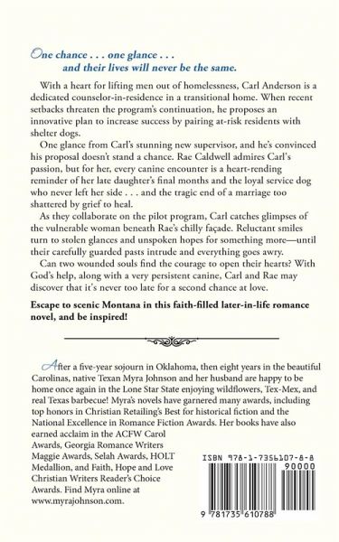 One chance . . . one glance . . . and their lives will never be the same. With a heart for lifting men out of homelessness, Carl Anderson is a dedicated counselor-in-residence in a transitional home. When recent setbacks threaten the program's continuation, he proposes an innovative plan to increase success by pairing at-risk residents with shelter dogs. One glance from Carl's stunning new supervisor, and he's convinced his proposal doesn't stand a chance. Rae Caldwell admires Carl's passion, but for her, every canine encounter is a heart-rending reminder of her late daughter's final months and the loyal service dog who never left her side . . . and the tragic end of a marriage too shattered by grief to heal. As they collaborate on the pilot program, Carl catches soul-stirring glimpses of the vulnerable woman beneath Rae's chilly façade. Reluctant smiles turn to stolen glances and unspoken hopes for something more-until their carefully guarded pasts intrude and everything goes awry. Can two wounded souls find the courage to open their hearts? With God's help, along with a very persistent canine, Carl and Rae may discover that it's never too late for a second chance at love. Escape to scenic Montana in this faith-filled later-in-life romance novel, and be inspired!