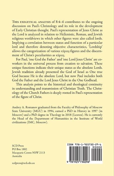 This exegetical analysis of 8:4-6 contributes to the ongoing discussion on Paul's Christology and its role in the development of Early Christian thought. Paul's representation of Jesus Christ as the Lord is analyzed in relation to Hellenistic, Roman, and Jewish religious worldviews in which other figures were also called lords. Implying a correlation between status and function of a particular lord and therefore denoting objective characteristics, 'Lordship' allows the categorization of various ¿¿¿¿¿¿-figures and the discernment of Christ's peculiarities as ¿¿¿¿¿¿. For Paul, 'one God the Father' and 'one Lord Jesus Christ' are coworkers in the universal process from creation to salvation. These unique functions indicate their unique status as the absolute Lords. Jewish tradition already presented the God of Israel as One true God because He is the absolute Lord, but now Paul includes both God the Father and the Lord Jesus Christ in the One Godhead. This analysis points to the historical and theological continuity in understanding and transmission of Christian Truth. The Christology of the Church Fathers is deeply rooted in Paul's representation of the figure of Christ.