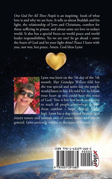One God For All These People is an inspiring book of what love is and why we are here. It tells us about Buddah and his light, the relationship of Jews and Christians, comfort for those suffering in prison, and about same sex love in todays world. It also has a special focus on world peace and world leader responsibilities. Yes we are one! So go ahead + enter the heart of God and let your light shine! Peace I leave with you, not war, but peace. Amen. God bless Lynn Lynn was born on the 7th day of the 7th month. Her Grandpa Wilson told her she was special and some day the people would listen to her. He told her to follow your heart so you could hear the voice of God. This is her first book and hopes to reach all people everywhere to give them comfort + hope through Gods' love. Lynn has a dog named Brandle and enjoys nature and animals and of course music and arts in general. Lynn currently resides in the state of Hawaii.
