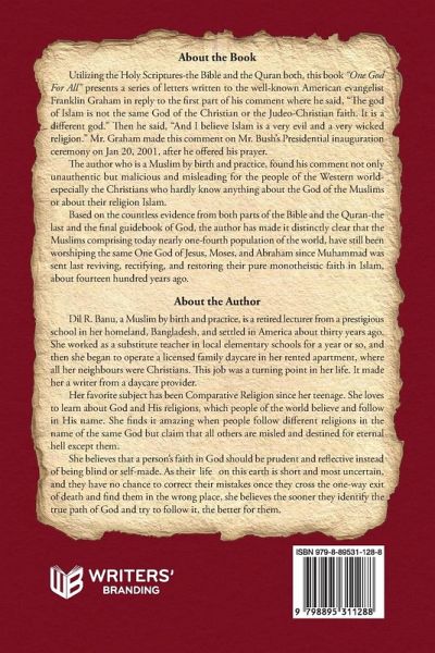 Synopsis: Utilizing the Holy Scriptures-the Bible and the Quran both, this book "One God For All" presents a series of letters written to the well-known American evangelist Franklin Graham in reply to the first part of his comment where he said, "The god of Islam is not the same God of the Christian or the Judeo-Christian faith. It is a different god." Then he said, "And I believe Islam is a very evil and a very wicked religion." Mr. Graham made this comment on Mr. Bush's Presidential inauguration ceremony on Jan 20, 2001, after he offered his prayer. The author who is a Muslim by birth and practice, found his comment not only unauthentic but malicious and misleading for the people of the Western world-especially the Christians who hardly know anything about the God of the Muslims or about their religion Islam. Based on the countless evidence from both parts of the Bible and the Quran-the last and the final guidebook of God, the author has made it distinctly clear that the Muslims comprising today nearly one-fifth population of the world, have still been worshiping the same One God of Jesus, Moses, and Abraham since Muhammad was sent last reviving, rectifying, and restoring their pure monotheistic faith in Islam, about fourteen hundred years ago. Autobiography: Dil R. Banu, a Muslim by birth and practice, is a retired lecturer from a prestigious school in her homeland, Bangladesh, and settled in America about thirty years ago. She worked as a substitute teacher in local elementary schools for a year or so, and then she began to operate a licensed family daycare in her rented apartment, where all her neighbours were Christians. This job was a turning point in her life, transforming her from a daycare provider into a writer. Her favorite subject has been Comparative Religion since her teenage years. She loves to learn about God and His religions, which people of the world believe and follow in His name. She finds it amazing when people follow different religions in the name of the same God but claim that all others are misled and destined for eternal hell except them. She believes that a person's faith in God should be prudent and reflective instead of being blind or self-made. Since life on this earth is short and most uncertain, and people have no chance to correct their mistakes once they cross the one-way exit of death and find themselves in the wrong place, she believes the sooner they identify the true path of God and try to follow it, the better for them.