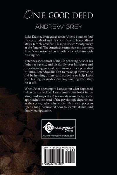Luka Krachec immigrates to the United States to find his cousin dead and his cousin's wife hospitalized after a terrible accident. He meets Peter Montgomery at the funeral. The American seems nice and captures Luka's attention when he offers to help him with his English. Peter has spent most of his life believing he shot his father at age six, and his family uses his regret and overwhelming guilt to keep him under their proverbial thumbs. Peter does his best to make up for what he did by helping others, and agreeing to help Luka with his English yields something amazing when they hit it off. When Peter opens up to Luka about what happened when he was a child, Luka senses some holes in the story and suspects Peter needs some help, so he approaches the head of the psychology department at the college where he works. Neither expects to open a long-barricaded door to secrets, denial, and family manipulation.