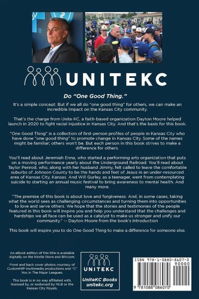Do "One Good Thing." It's a simple concept. But if we all do "one good thing" for others, we can make an incredible impact on the Kansas City community. That's the charge from Unite KC, a faith-based organization Dayton Moore helped launch in 2020 to fight racial injustice in Kansas City. And that's the basis for this book. "One Good Thing" is a collection of first-person profiles of people in Kansas City who have done "one good thing" to promote change in Kansas City. Some of the names might be familiar; others won't be. But each person in this book strives to make a difference for others. You'll read about Jeremiah Enna, who started a performing arts organization that puts on a moving performance yearly about the Underground Railroad. You'll read about Taylor Penrod, who, along with her husband Jimmy, felt called to leave the comfortable suburbs of Johnson County to be the hands and feet of Jesus in an under-resourced area of Kansas City, Kansas. And Will Gurley, as a teenager, went from contemplating suicide to starting an annual music festival to bring awareness to mental health. And many more. "The premise of this book is about love and forgiveness. And, in some cases, taking what the world sees as challenging circumstances and turning them into opportunities to love and serve others. We hope that the stories and testimonies of the people featured in this book will inspire you and help you understand that the challenges and hardships we all face can be used as a catalyst to make us stronger and unify our community." -- Dayton Moore from the book's Introduction This book will inspire you to do One Good Thing to make a difference for someone else.