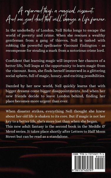 A reformed thief, a magical viscount, And one good deed that will change a life forever. In the underbelly of London, Nell Birks longs to escape the world of poverty and crime. When she rescues a wealthy gentleman from a gang of thieves, Nell is tasked with robbing the powerful spellcaster Viscount Finlington - as recompense for stealing a mark from a notorious crime lord. Confident that learning magic will improve her chances of a better life, Nell leaps at the opportunity to learn magic from the viscount. Soon, she finds herself immersed in a glittering social sphere, full of magic, luxury, and exciting possibilities. Dazzled by her new world, Nell quickly learns that with bigger dreams come bigger disappointments. And when her new friends decide to leave London behind, finding her place becomes more urgent than ever. When disaster strikes, everything Nell thought she knew about her old life is shaken to its core. But if magic is not her key to a better life, she's more lost than when she began. This new adult fantasy is the second book in the Meddle & Mend series. It takes place shortly after Letters to Half Moon Street but can be read as a standalone.
