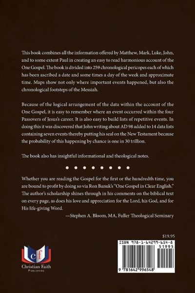 This book combines all the information offered by Matthew, Mark, Luke, John, and to some extent Paul in creating an easy to read harmonious account of the One Gospel. The book is divided into 259 chronological periscopes each of which has been ascribed a date and some times a day of the week and approximate time. Maps show not only where important events happened, but also the chronological footsteps of the Messiah. Because of the logical arrangement of the data within the account of the One Gospel, it is easy to remember where an event occurred within the four Passovers of Jesus's career. It is also easy to build lists of repetitive events. In doing this it was discovered that John writing about AD 98 added to 14 data lists containing seven events thereby putting his seal on the New Testament because the probability of this happening by chance is one in 30 million. The book also has insightful informational and theological notes. Whether you are reading the Gospel for the first or the hundredth time, you are bound to profit by doing so via Ron Banuk's "One Gospel in Clear English." The author's scholarship shines through in his comments on the biblical text on every page, as does his love and appreciation for the Lord, his God, and for His life-giving Word. -Stephen A. Bloom, MA, Fuller Theological Seminary