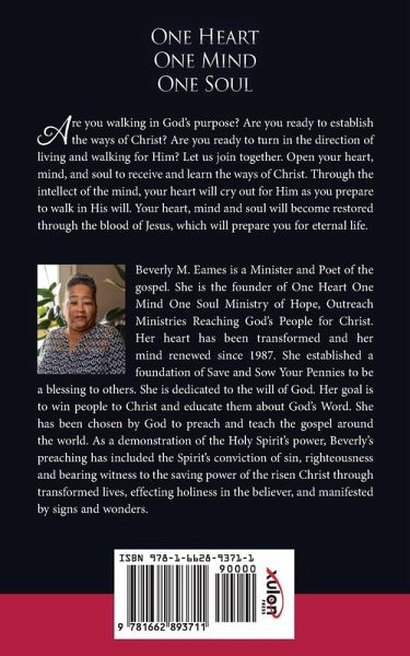 Are you walking in God's purpose? Are you ready to establish the ways of Christ? Are you ready to turn in the direction of living and walking for Him? Let us join together. Open your heart, mind, and soul to receive and learn the ways of Christ. Through the intellect of the mind, your heart will cry out for Him as you prepare to walk in His will. Your heart, mind and soul will become restored through the blood of Jesus, which will prepare you for eternal life. Beverly M. Eames is a Minister and Poet of the gospel. She is the founder of One Heart One Mind One Soul Ministry of Hope, Outreach Ministries Reaching God's People for Christ. Her heart has been transformed and her mind renewed since 1987. She established a foundation of Save and Sow Your Pennies to be a blessing to others. She is dedicated to the will of God. Her goal is to win people to Christ and educate them about God's Word. She has been chosen by God to preach and teach the gospel around the world. As a demonstration of the Holy Spirit's power, Beverly's preaching has included the Spirit's conviction of sin, righteousness and bearing witness to the saving power of the risen Christ through transformed lives, effecting holiness in the believer, and manifested by signs and wonders.