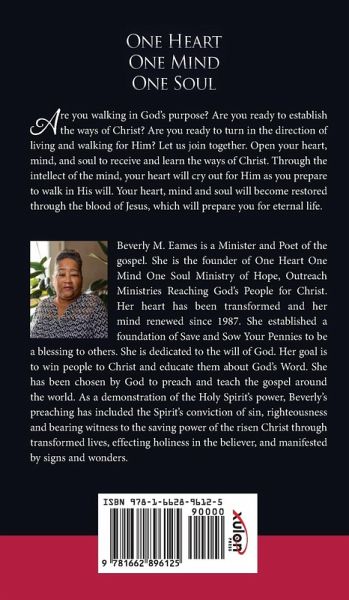 Are you walking in God's purpose? Are you ready to establish the ways of Christ? Are you ready to turn in the direction of living and walking for Him? Let us join together. Open your heart, mind, and soul to receive and learn the ways of Christ. Through the intellect of the mind, your heart will cry out for Him as you prepare to walk in His will. Your heart, mind and soul will become restored through the blood of Jesus, which will prepare you for eternal life. Beverly M. Eames is a Minister and Poet of the gospel. She is the founder of One Heart One Mind One Soul Ministry of Hope, Outreach…mehr