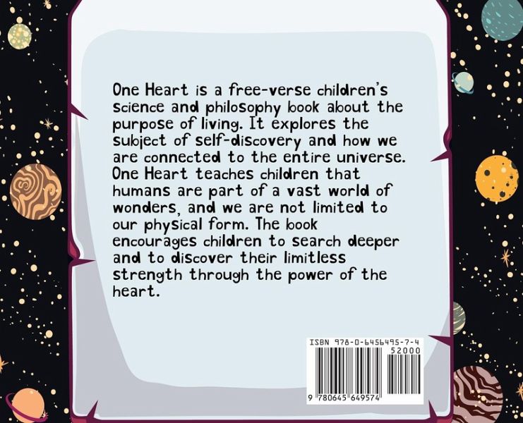 One Heart is a free-verse children's science and philosophy book about the purpose of living. It explores the subject of self-discovery and how we are connected to the entire universe. One Heart teaches children that humans are part of a vast world of wonders, and we are not limited to our physical form. The book encourages children to search deeper and to discover their limitless strength through the power of the heart.