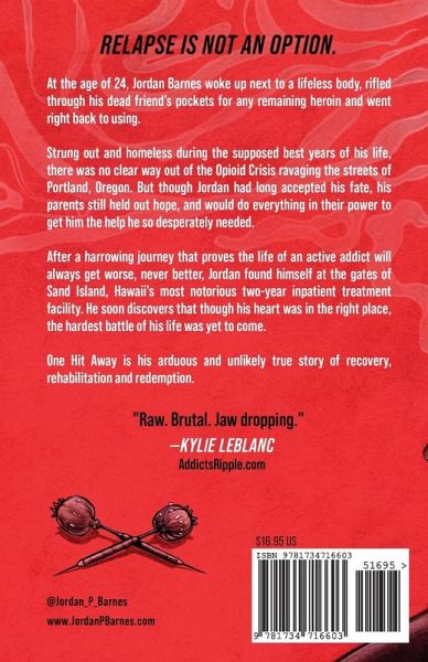 WINNER OF 2020's "BEST BOOK OF THE YEAR AWARD" BY INDIES TODAY, A FINALIST IN THE 15th ANNUAL NATIONAL INDIE EXCELLENCE AWARDS & RECIPIENT OF AN INDIE B.R.A.G. MEDALLION At the age of 24, Jordan Barnes woke up next to a lifeless body, rifled through his dead friend's pockets for any remaining heroin and went right back to using. Strung out and homeless during the supposed best years of his life, there was no clear way out of the Opioid Crisis ravaging the streets of Portland, Oregon. But though Jordan had long accepted his fate, his parents still held out hope, and would do everything in their power to get him the help he so desperately needed. After a harrowing journey that proves the life of an addict will always get worse, never better, Jordan found himself at the gates of Sand Island, Hawaii's most notorious two-year inpatient treatment facility. He soon discovers that though his heart was in the right place, the hardest battle of his life was yet to come. One Hit Away is his arduous and unlikely true story of recovery, rehabilitation and redemption. "One Hit Away is a gripping, startling account into addiction, compassion and ultimate salvation. It is powerful because of its honesty. Raw without being sensationalistic, this harrowing account of Jordan's journey provides insight and compassion into the struggle of addiction. It is an important, engrossing book that is hard to put down." ANNIE GRACE, AUTHOR THIS NAKED MIND: CONTROL ALCOHOL, FIND FREEDOM, DISCOVER HAPPINESS & CHANGE YOUR LIFE. "One Hit Away takes you on a journey you won't forget. An honest expression of such a common and hardcore reality is so necessary. This memoir is a work of art, truth and healing on a level many of us have yet to encounter." KAYLEON DORTCH-ELLIOTT, AUTHOR ONE DAY AT A TIME: REMAINING IN STEP "Raw, brutal and jaw dropping. Jordan Barnes exposes his readers to the depths of hell that is heroin addiction. His transparency brings a level of understanding and empathy to anyone who has ever been touched by addiction." KYLIE LEBLANC, ADDICTS RIPPLE
