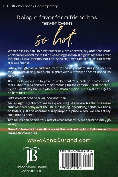 Doing a favor for a friend has never been so hot. When an injury sidelined my career as a pro cricketer, my American mate Chelsea convinced me to take a coaching position at a girls' school. I never thought I'd love that job, but I do. So yeah, I owe Chelsea a lot. But we're still just friends. Lately, though, we've suffered from the same problem. Our jobs keep us too busy for dating, but a one-nighter with a stranger doesn't appeal to either of us. Then Chelsea asks me to pose for a "beefcake" calendar of former cricketers. That means shirtless men preening for the camera. It's all for charity, so I can't say no. But when our photo session turns red hot, I get a brilliant idea. Let's do each other a favor, now and then. Yes, all right. By "favor" I mean a quick shag. We have rules that will make sure we never stray over the line. No kissing. No holding hands. No beds, no hotels, just the occasional inappropriate place where we can satisfy each other's needs. Two adults can handle this sort of arrangement. What could possibly go wrong? One Hot Favor is the ninth book in the bestselling Hot Brits series of romantic comedies.