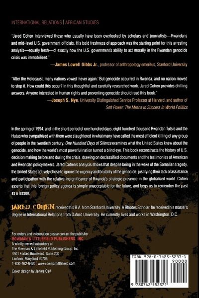 In the spring of 1994, eight-hundred thousand Rwandan Tutsis and Moderate Hutus were killed in a horrific genocide. One Hundred Days of Silence is a scathing look at the challenges of humanitarian intervention, the history of U.S. policy toward the 1994 Rwanda genocide, and the role of genocide in the larger context of strategic studies. It looks at the principal questions of what the U.S. knew, and why it didn't intervene, and how non-intervention was justified within the American bureaucracy.