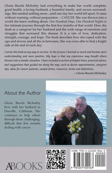 Gloria Burola McSorley had everything to make her world complete; good health, a loving husband, a beautiful family, and secure surroundings. She needed nothing more...until one day her world fell apart. It came without warning, without preparation-CANCER. She was thrown into a world she knew nothing about. One Hundred Days, One Hundred Nights is her intimate journey through the first few months of that world. How she dealt as a caregiver for her husband and the wide range of emotions and struggles that surround this disease. It is a tale of love, dedication, strength, courage, and hope. The book describes how she coped with the ups and downs and all the in between. She was even able to find a bright side at the end of each day.