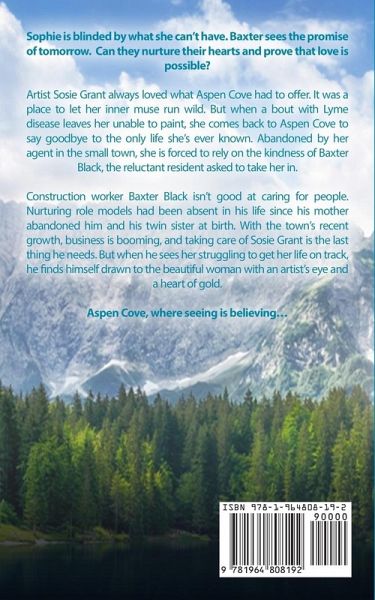 Sosie is blinded by what she can't have. Baxter sees the promise of tomorrow. Can they nurture their hearts and prove that love is possible? Artist Sosie Grant always loved what Aspen Cove had to offer. It was a place to let her inner muse run wild. But when a bout with Lyme disease leaves her unable to paint, she comes back to Aspen Cove to say goodbye to the only life she's ever known. Abandoned by her agent in the small town, she is forced to rely on the kindness of Baxter Black, the reluctant resident asked to take her in. Construction worker Baxter Black isn't good at caring for people. Nurturing role models had been absent in his life since his mother abandoned him and his twin sister at birth. With the town's recent growth, business is booming, and taking care of Sosie Grant is the last thing he needs. But when he sees her struggling to get her life on track, he finds himself drawn to the beautiful woman with an artist's eye and a heart of gold. Aspen Cove, where seeing is believing...
