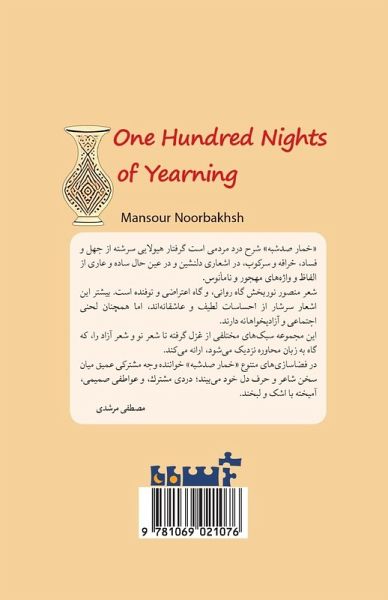 "One Hundred Nights of Yearning" is a collection of poems by Mansour Noorbakhsh, composed from the year 2009 onward, with the exception of one poem written in 1981. These poems either bear witness to the wounds and outcries of the Iranian people over these years or reflect the poet's contemplations and introspections. Most of these poems are undated, as they express a pain that has echoed and repeated throughout all these years. Mansour Noorbakhsh is a poet, writer, and translator, creating works in both English and Persian (Farsi), his native language. His writings advocate for freedom, human rights, and environmental awareness. He believes that dialogue between people across the world is essential for fostering peace, and that poetry serves as a powerful medium to amplify the call for human rights. Mansour is the York Region Branch Manager and a Member-at-Large on the Executive of The Ontario Poetry Society. He has also hosted The Contemporary Canadian Poets, a weekly Persian radio program (persianradio.net Telegram: Ottawa Radio). In this program, he introduces Canadian poets to Persian-speaking audiences by translating their biographies and poetry into Farsi. Both English readings (by the poets) and Persian readings (by Mansour) are broadcasted, fostering cultural exchange between Persian-speaking communities and Canadian literature. Publications Mansour has published several books, articles, and poems in Persian, including: ¿¿ ¿¿¿¿ ¿¿ ¿¿¿ ¿¿ ¿¿¿¿ / ¿¿¿¿¿ ¿ ¿¿¿ ¿¿¿¿¿ ¿¿¿¿¿ (Life and Poetry of Sohrab Sepehri), Morvarid, Tehran, 1997. ¿¿¿¿¿ ¿¿ ¿¿¿ / ¿¿¿¿¿ ¿ ¿¿¿ ¿¿¿¿¿¿ ¿¿¿¿ (Life and Poetry of Manuchehr Atashi), Jameshenasan, Tehran, 2024. His works in English include: In Search of Shared Wishes, FriesenPress, Canada, 2017. In Search of Shared Wishes - FriesenPress Till You Recognize Me, Mosaic Press, Canada, 2024. Till You Recognize Me - Mosaic Press Powdery Wings: Stories of Immigration, Mosaic Press, Canada, 2024. Powdery Wings - Mosaic Press Mansour continues to write, translate, and build bridges between cultures through literature and poetry.