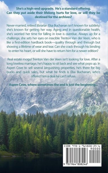 She's a high-end upgrade. He's a standard offering. Can they put aside their lifelong hurts for love, or will they be destined for the archives? ¿¿¿¿¿¿¿ Never-married, retired librarian Elsa Buchanan isn't known for subtlety; she's known for getting her way. Aging and in questionable health, she's worried her time for falling in love is overdue. Always up for a challenge, she sets her eyes on irascible Trenton Van der Veen, who is like a first-edition hardback book-quality through and through but showing a lifetime of wear and tear. Can she crack through his binding to enter his heart, or will she have to return him for a newer edition? Real estate mogul Trenton Van der Veen isn't looking for love. After a long loveless marriage, he's happy to sit back and see what pops up. In Aspen Cove to sell several languishing properties, he's there for big bucks and quick sales, but what he finds is Elsa Buchanan, who's offered him a deal he can't refuse. Aspen Cove, where sometimes the end is just the beginning...