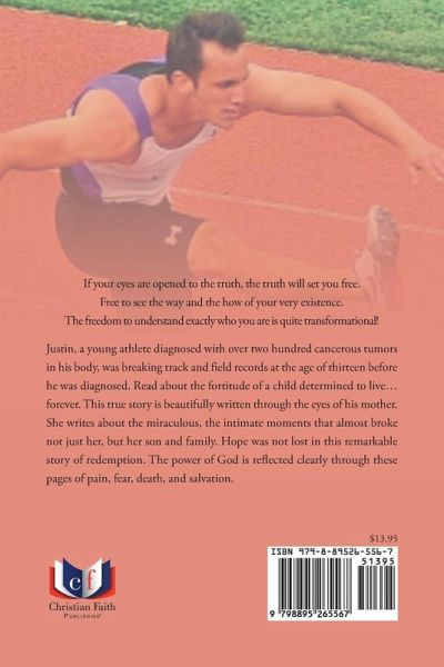 If your eyes are opened to the truth, the truth will set you free. Free to see the way and the how of your very existence. The freedom to understand exactly who you are is quite transformational! Justin, a young athlete diagnosed with over two hundred cancerous tumors in his body, was breaking track and field records at the age of thirteen before he was diagnosed. Read about the fortitude of a child determined to live...forever. This true story is beautifully written through the eyes of his mother. She writes about the miraculous, the intimate moments that almost broke not just her, but her son and family. Hope was not lost in this remarkable story of redemption. The power of God is reflected clearly through these pages of pain, fear, death, and salvation.