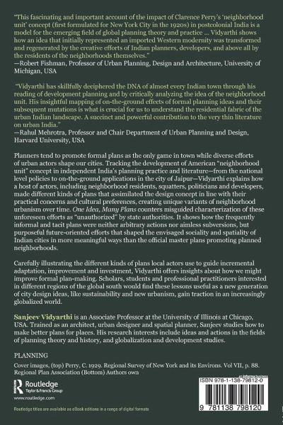 Planners tend to promote formal plans as the only game in town while diverse efforts of urban actors shape our cities. Tracking the development of American "neighborhood unit" concept in independent India's planning practice and literature-from the national level policies to on-the-ground applications in the city of Jaipur-Vidyarthi explains how a host of actors including neighborhood residents, squatters, politicians and developers made different kinds of plans that assimilated the design concept in line with their practical concerns and cultural preferences creating unique variants of neighborhood urbanism over time. One Idea, Many Plans counters misguided characterization of these unforeseen efforts as 'unauthorized' by state authorities. It shows how the frequently informal and tacit plans were neither arbitrary actions nor aimless subversions but purposeful future-oriented efforts that shaped the envisaged sociality and spatiality of Indian cities in more meaningful ways than the official master plans promoting planned neighborhoods. Carefully illustrating the different kinds of plans local actors use to guide incremental adaptation, improvement and investment, Vidyarthi offers insights about how we might improve formal plan making. Scholars, students and professional practitioners interested in different regions of the global south would find these lessons useful as a new generation of city design ideas like sustainability and new urbanism gain traction in an increasingly globalized World.