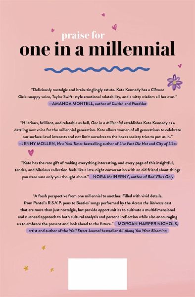 "Hilarious, brilliant, and relatable as hell, ONE IN A MILLENNIAL establishes Kate Kennedy as a dazzling new voice for the millennial generation. In every fresh, insightful, and sneakily powerful essay, Kate excavates personal memories and pop culture moments by pinpointing exactly why they were so meaningful and formative. She allows women of all generations to celebrate our surface-level interests and not limit ourselves to the boxes society tries to put us in."
