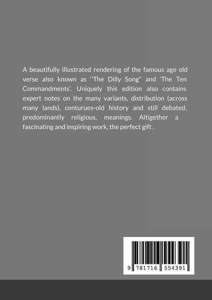 A beautifully illustrated rendering of the famous age old verse also known as ''The Dilly Song'' and 'The Ten Commandments'. Uniquely this edition also contains expert notes on the many variants, distribution (across many lands), centurues-old history and still debated, predominantly religious, meanings. Altigether a most fascinating and inspiring work.