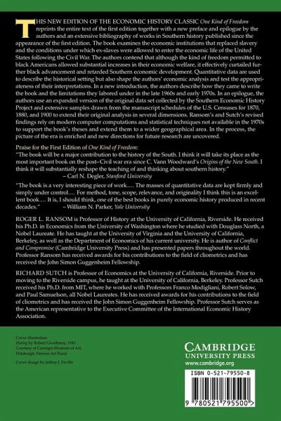 This edition of the economic history classic One Kind of Freedom reprints the entire text of the first edition together with an introduction by the authors and an extensive bibliography of works in Southern history published since the appearance of the first edition. The book examines the economic institutions that replaced slavery and the conditions under which ex-slaves were allowed to enter the economic life of the United States following the Civil War. The authors contend that although the kind of freedom permitted to black Americans allowed substantial increases in their economic welfare, it effectively curtailed further black advancement and retarded Southern economic development. Quantitative data are used to describe the historical setting but also shape the authors' economic analysis and test the appropriateness of their interpretations. Ransom and Sutch's revised findings enrich the picture of the era and offer directions for future research.