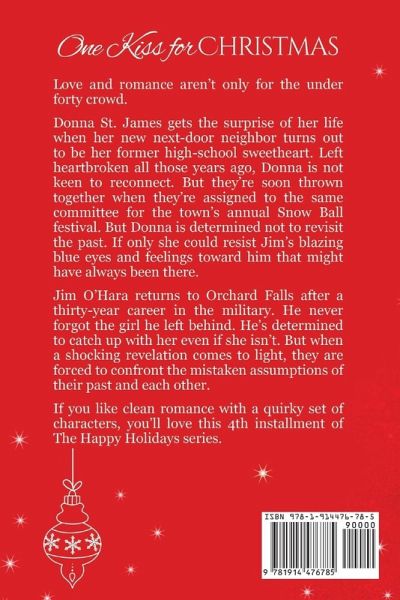 Love and romance aren't only for the under forty crowd. Donna St. James gets the surprise of her life when her new next-door neighbor turns out to be her former high-school sweetheart. Left heartbroken all those years ago, Donna is not keen to reconnect. But they're soon thrown together when they're assigned to the same committee for the town's annual Snow Ball festival. But Donna is determined not to revisit the past. If only she could resist Jim's blazing blue eyes and feelings toward him that might have always been there. Jim O'Hara returns to Orchard Falls after a thirty-year career in the military. He never forgot the girl he left behind. He's determined to catch up with her even if she isn't. But when a shocking revelation comes to light, they are forced to confront the mistaken assumptions of their past and each other. If you like clean romance with a quirky set of characters, you'll love this 4th installment of The Happy Holidays series. Each book in the series is a standalone novel and therefore can be read in any order.