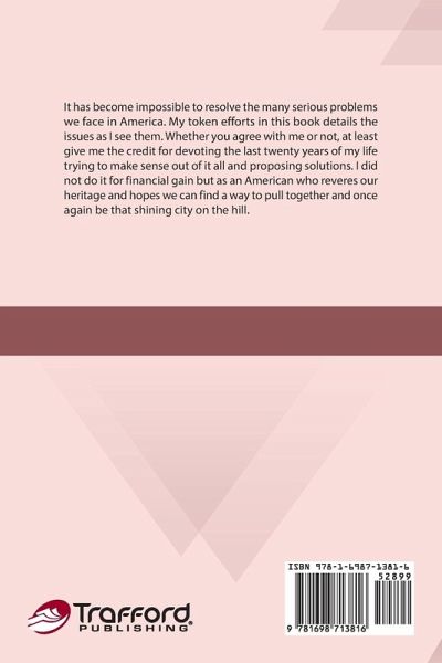It has become impossible to resolve the many serious problems we face in America. My token efforts in this book details the issues as I see them. Whether you agree with me or not, at least give me the credit for devoting the last twenty years of my life trying to make sense out of it all and proposing solutions. I did not do it for financial gain but as an American who reveres our heritage and hopes we can find a way to pull together and once again be that shining city on the hill.